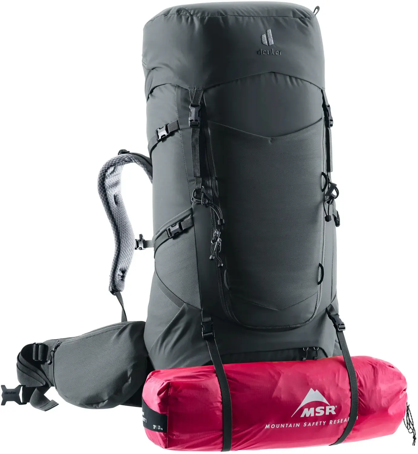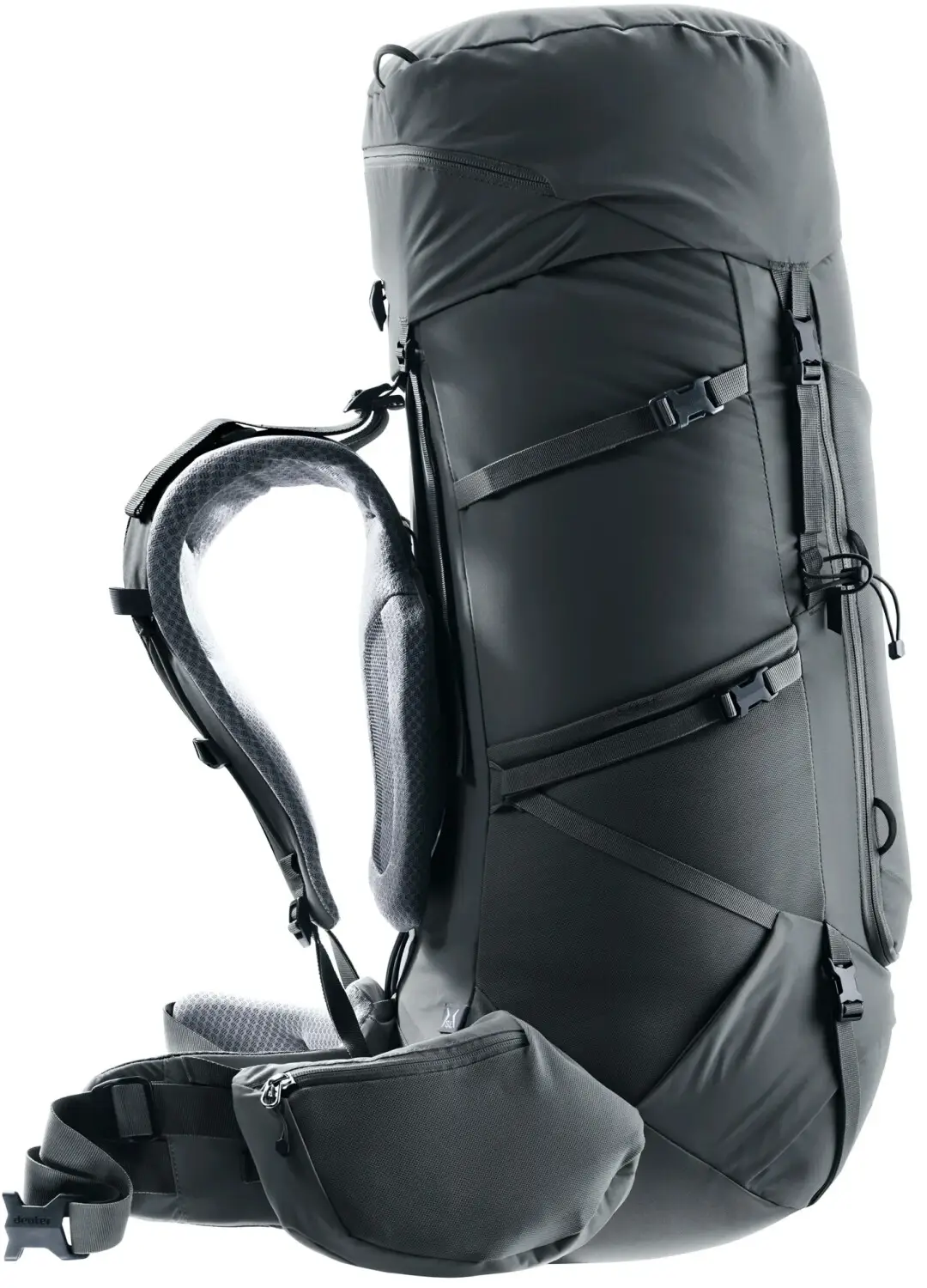Die Hüftflossen verteilen das Gewicht gleichmäßig, und der freiliegende Aluminium-Rahmen sorgt für Stabilität sowie eine gute Belüftung zusammen mit dem Air-Spacer-Mesh. Geräumige Taschen und eine große Frontöffnung machen die Ausrüstung schnell zugänglich.