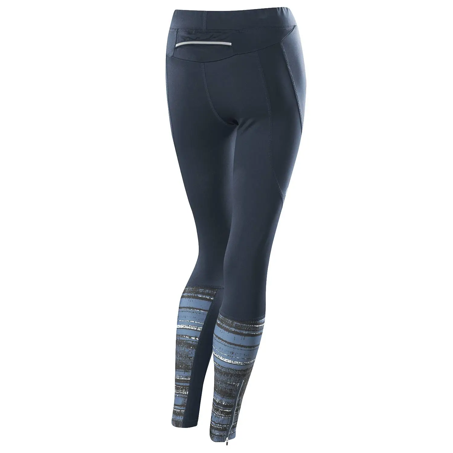 Hochelastisch, schnell trocknend, Druckmotiv am Unterschenkel, lang, geformtes Knie, elastischer Bund, Rückentasche, kurzer Beinzip, Reflektoren.